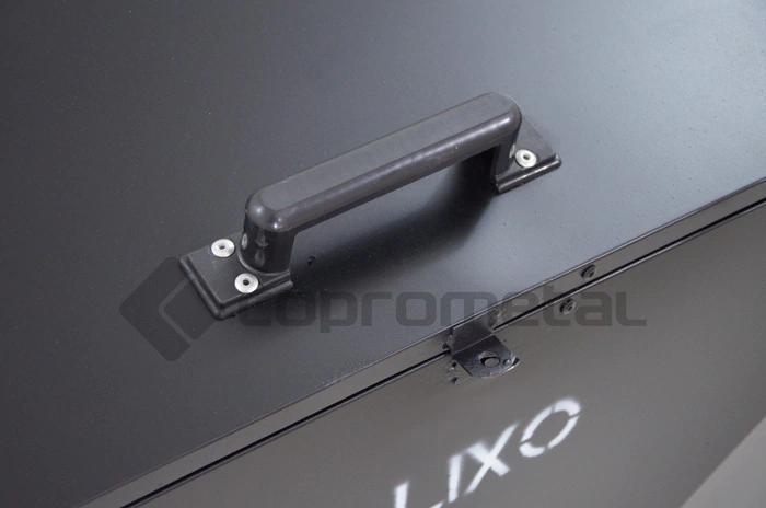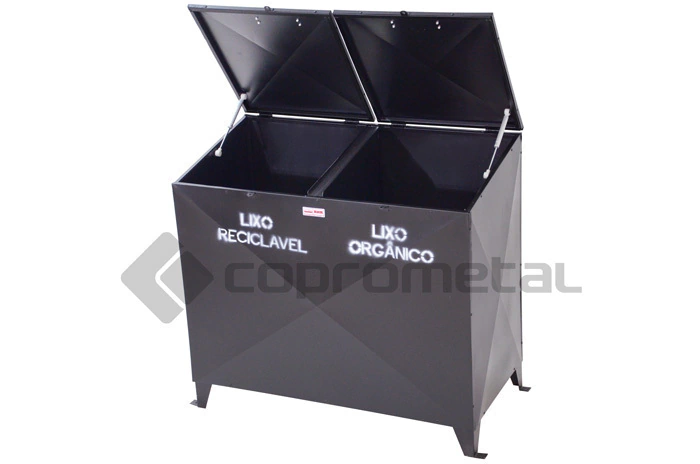 Lixeira tipo container fabricada em aço, ótima para residências e pequenos condomínios. Possui dois compartimentos, ideal para lixo reciclável e orgânico.